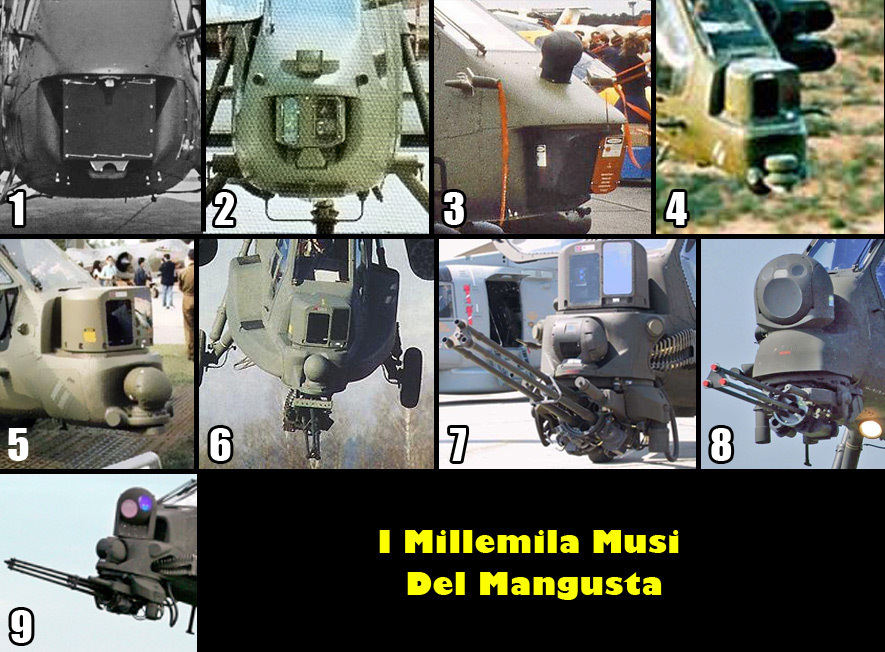Ricapitolando: le prime tre configurazioni erano sperimentali e dunque mai adottate sugli esemplari operativi consegnati all’EI. La 4°, la 5° e la 7° sono le stesse, cambia solo la presenza o meno del PNVS e del cannone (presente su tutti gli esemplari). La 6° è sperimentale dell’Agusta destinata all’International; l’8° è turca, mentre la 9° verrà montata su tutti gli esemplari dell’AW129 Italiano.