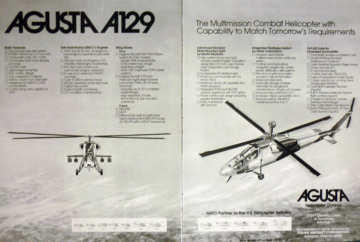 La versione A129ASH fu proposta dalla Agusta all’Air Cavalry degli USA ma non è mai arrivata allo stadio di prototipo. La pubblicità qui di seguito è stata diffusa già prima del primo test di volo dell’A129.