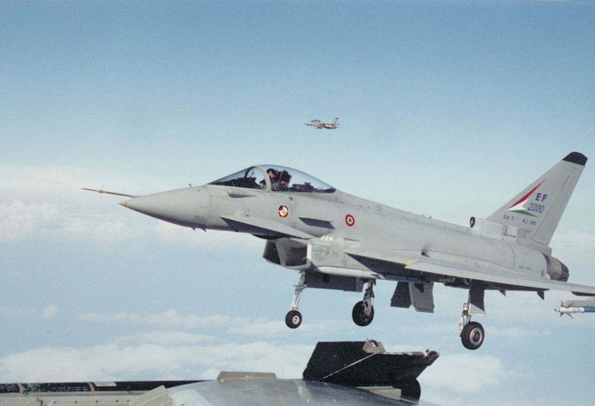 - Sulla coda dell’Eurofighter è possibile notare la denominazione EF-2000. Il velivolo in questione è dell’Aeronautica Militare Italiana.