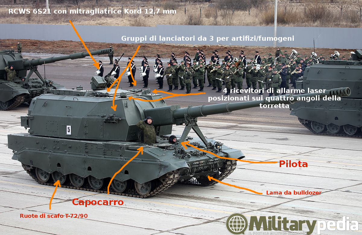 Per quanto riguarda la gestione del tiro, è presente il BMS (Battle Management System) Sozveidie dell’Esercito Russo in grado di scegliere autonomamente il proiettile più adatto al contesto con la relativa carica di lancio.