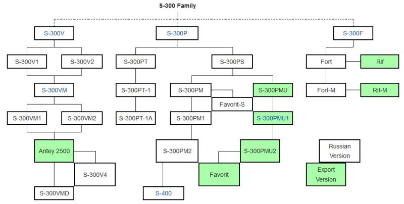 La famiglia del sistema S-300 è costituita da numerose varianti, suddivise in 3 categorie principali. La designazione avviene con le lettere P,V e F.